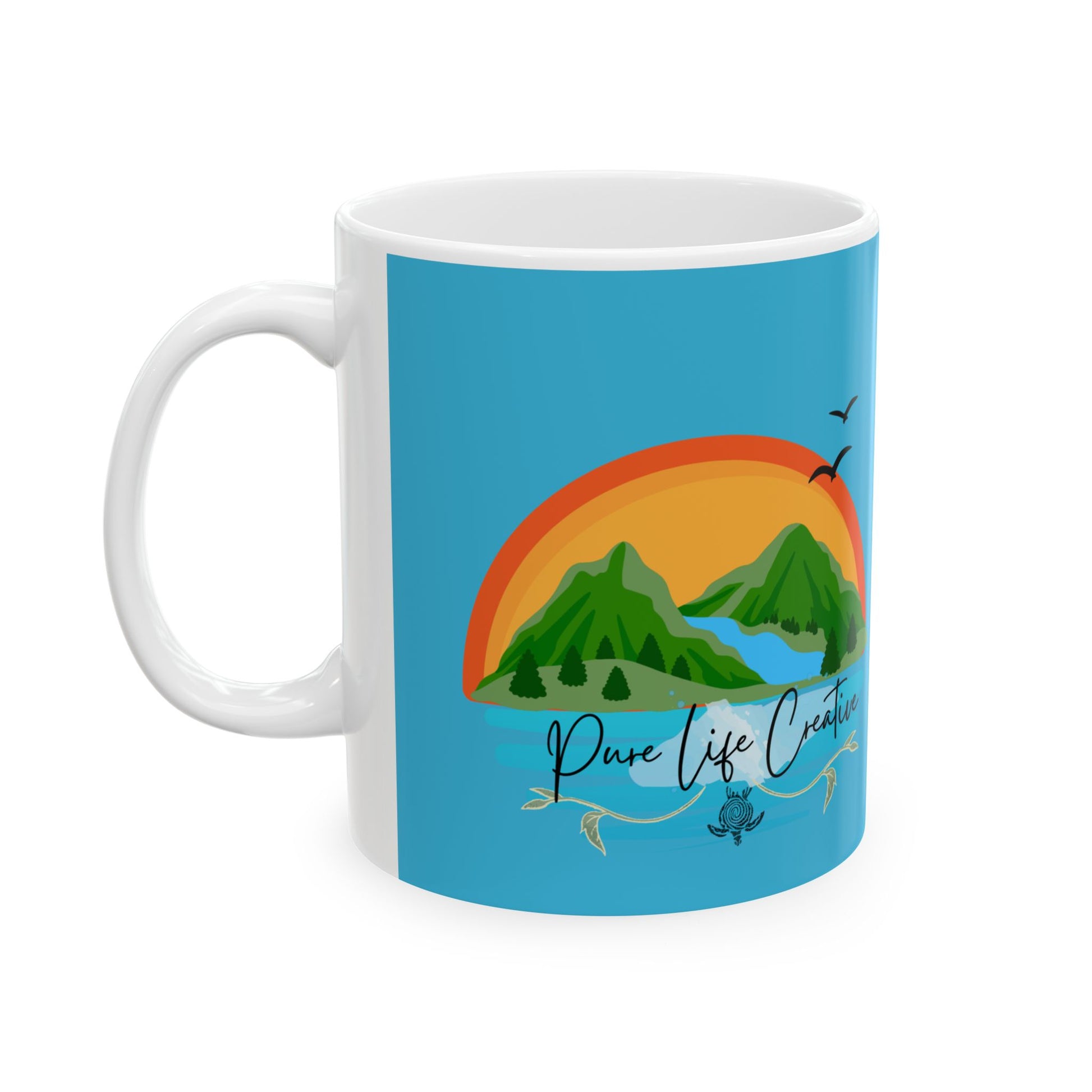 Tropical Sunset Ceramic Mug — “Pure Life” Costa Rica Coffee Cup (11oz/15oz)